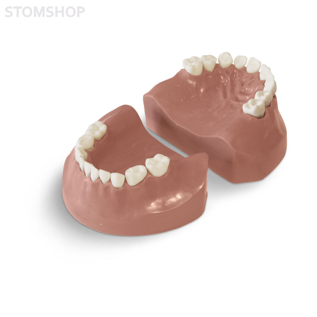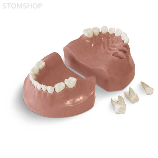 Детская модель верхней и нижней челюсти с 20-ю молочными зубами, которые плотно установлены в синтетическом полимерном материале, зубы могут извлекаться и фиксироваться обратно, зубы заменяемые. Подходит для использования в фантомных головах, артикуляторах и на подставке.