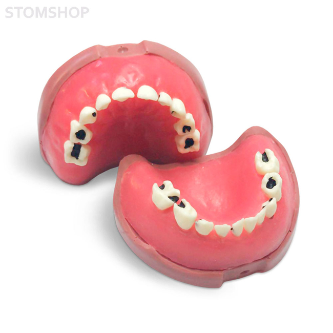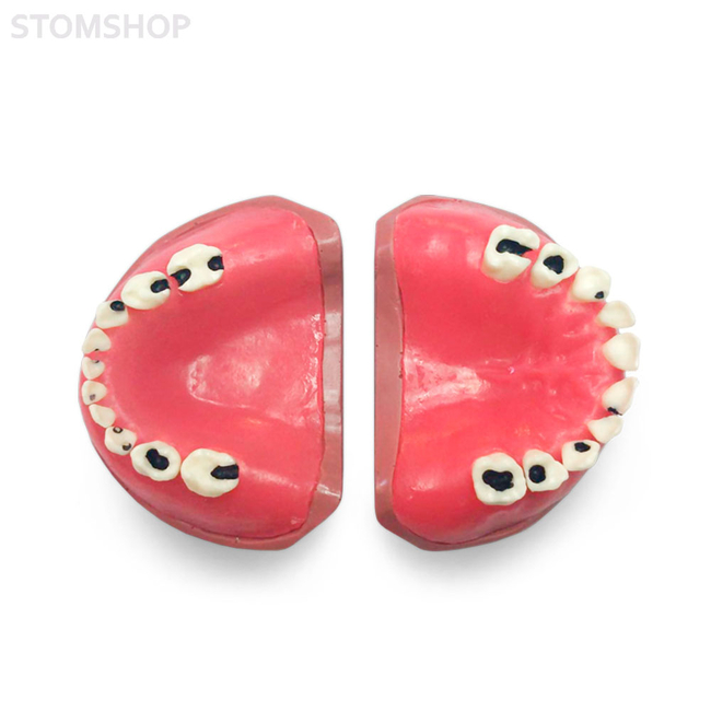 Модель верхней и нижней детской челюсти для работы на фантоме с молочными зубами. Зубы съемные, с кариесом. Десна эластичная, заменяемая. Подходит для использования в фантомных головах, артикуляторах и на подставке.