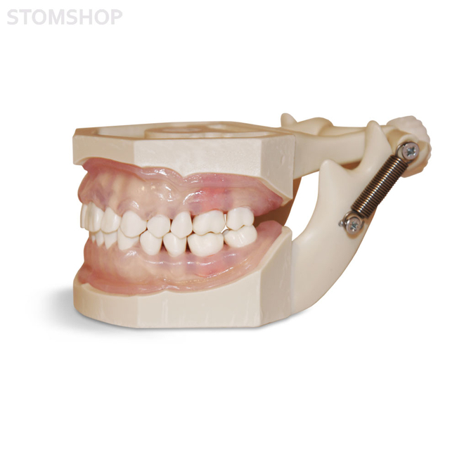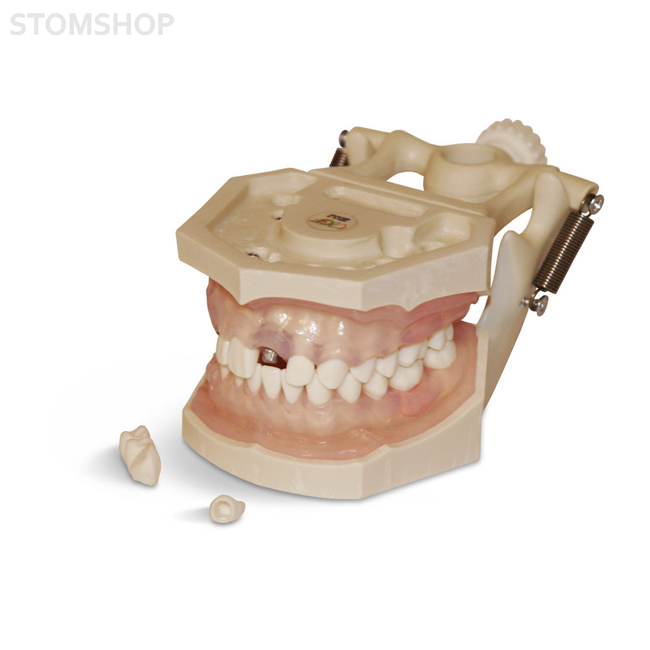 Пародонтологическая модель верхней и нижней челюсти с выраженными пародонтальными карманами и резорбцией костной ткани в области 16, 26, 36, 46 зубов, с различной степенью поражения пародонта во фронтальном отделе, явлениями периимплантита в области 15, 13, 21 зубов. Десна розовая или прозрачная, эластичная, заменяемая. Зубы из мягкого материала resine, заменяемые, фиксируются при помощи винтового крепления. Подходит для использования в фантомных головах, артикуляторах и на подставке.