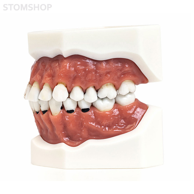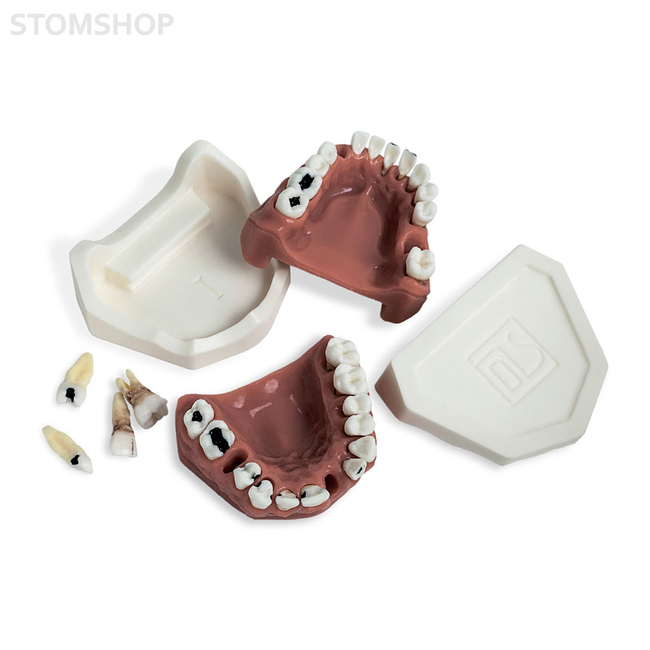 Состоит из 28 зубов, выполненных из податливого материала для работы с микромотором. Справа в боковом и фронтальном отделах представлены заболевания пародонта на разных стадиях прогрессирования, клиновидные дефекты, пародонтальные карманы, над- и поддесневые зубные отложения. Слева находятся зубы с кариозными полостями I , II, III, IV, V классов по Блэку.