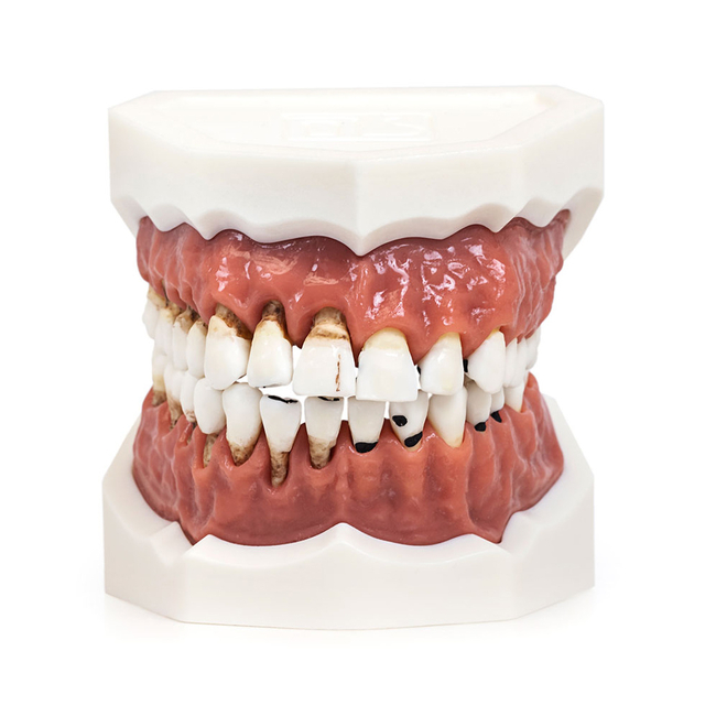 Модель верхней и нижней челюсти с патологией пародонта, с над- и поддесневыми зубными отложениями, кариозными полостями.