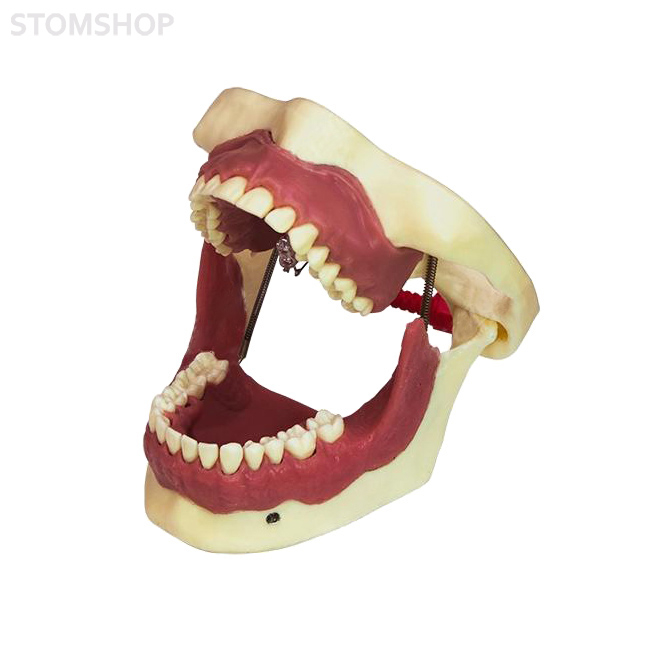 Денто-модель верхней и нижней челюстей с эластичной десной, анатомически соответствующую зубочелюстному аппарату взрослого пациента. Смыкание реализовано в стабильной окклюзии, с комплектом из 28 модельных зубов.