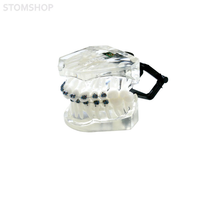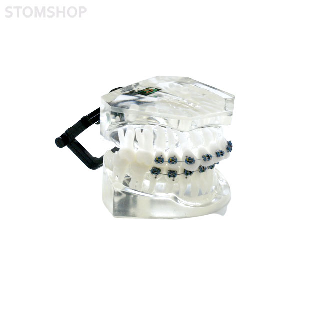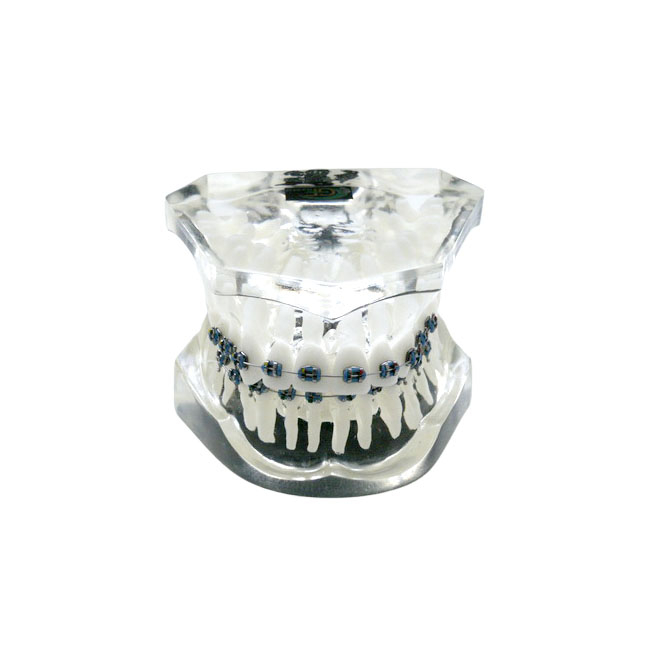 Ортодонтическая модель из прозрачной пластмассы, с фронтальной аномалией и с брекетами 2 класса. Твердая десна. Нижняя челюсть располагается дистально, медиальный преддверный бугорок первого моляра верхней челюсти находится впереди межбугорковой бороздки первого моляра нижней челюсти с первым подклассом — сужение верхнего зубного ряда с наклоном фронтальных зубов вперед.
