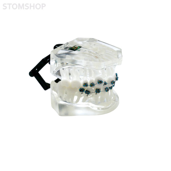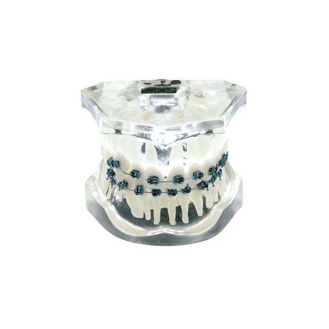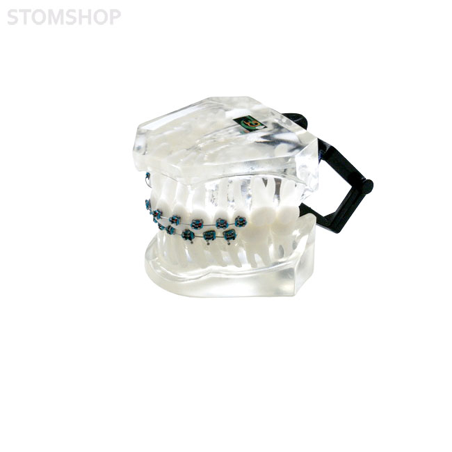 Ортодонтическая модель из прозрачной пластмассы, с фронтальной аномалией и с брекетами. Твердая десна. Сагиттальная аномалия. Дистопия верхнего правого клыка.