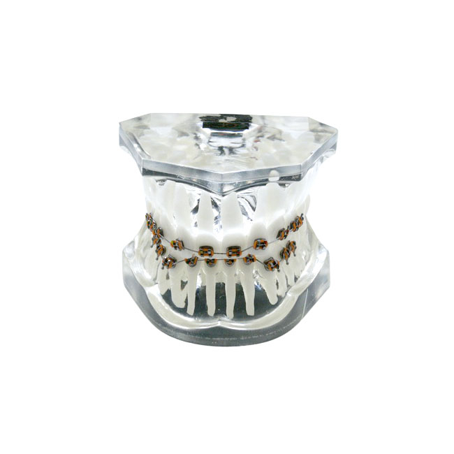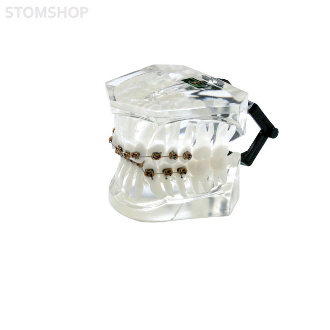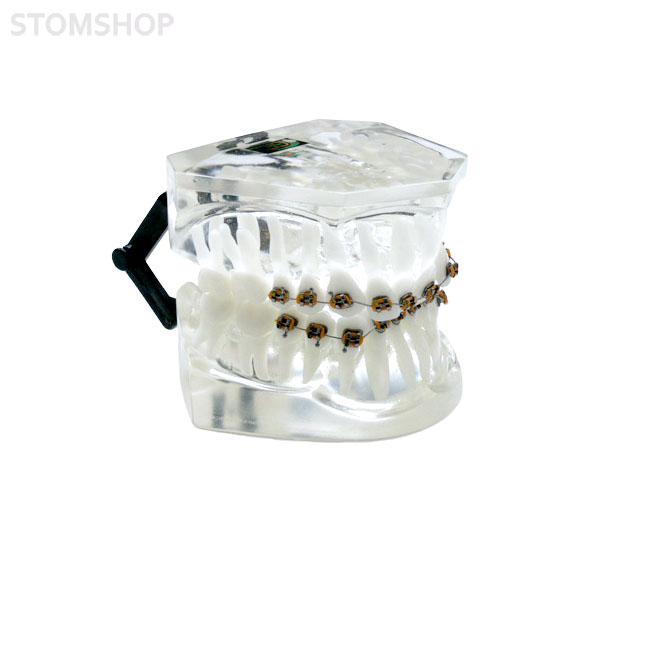 Ортодонтическая модель из прозрачной пластмассы, с фронтальной аномалией и брекетами 2 класса, 2 подкатегории. Нижняя челюсть располагается дистально, медиальный преддверный бугорок первого моляра верхней челюсти находится впереди межбугорковой бороздки первого моляра нижней челюсти. Верхние и нижние фронтальные зубы наклонены назад, дыхание через нос. Дистальный прикус. Твердая десна.