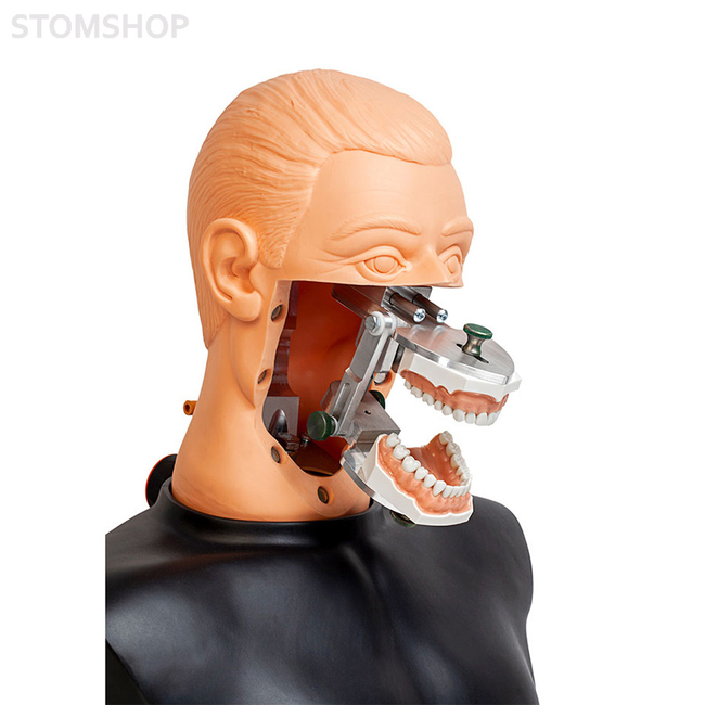 Фантом Standart Plus состоит из нескольких частей: симулятор черепа, симулятор торса пациента (черный, бежевый), съемная эластичная лицевая маска рта (среднее открытие 65×50 мм), язык, металлический выдвижной артикулятор. Имеет три вида крепления: крепление на стоматологическую установку, крепление на край стола, крепление с возможностью скрыть фантом под столешницу учебного стола.