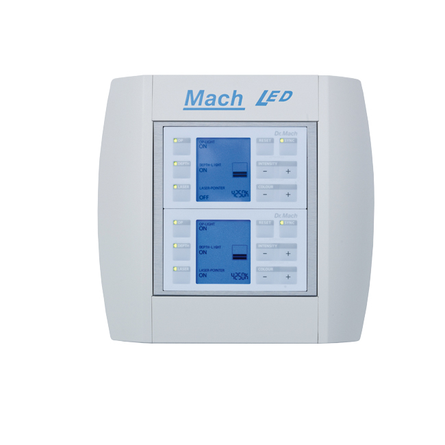 Предусмотрена панель управления на корпусе светильника и настенная панель (опция) для следующих функций: вкл/выкл, глубина света, лазерный указатель, электронная регулировка яркости, свет для эндоскопии, изменение цветовой температуры: 3750, 4000, 4250, 4500, 4750 К (для моделей MC). Все шарниры операционного светильника вращаются на 360° (потолочный вариант).