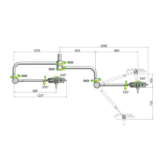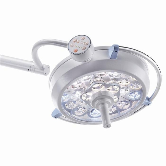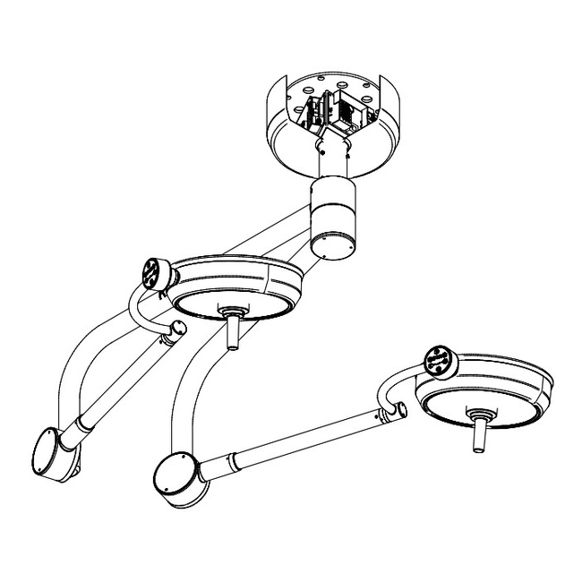 ORION 40 + 40 - операционный потолочный бестеневой двухкупольный светильник с освещенностью 130 000 Лк. Каждый купол светильника состоит из 30 эллиптических рефлекторов и содержит 6 разделенных модулей, каждый из которых содержит по 5 светодиодов. Вокруг купола операционного светильника проходит алюминиевое кольцо, позволяющее облегчить позиционирование светильника в пределах операционного поля. Панель управления расположена на каждом куполе.