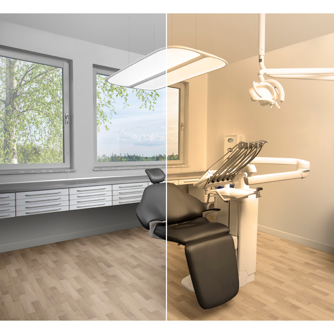 В стоматологических клиниках и зуботехнических лабораториях гигиена является одним из наиболее важных факторов, поэтому Вам может потребоваться любая помощь для предотвращения распространения загрязнения и бактерий. Светильник Clair разрабатывался специально для размещения в медицинских учреждениях, исходя из чего, его стерильности было уделено отдельное внимание. Осветительные приборы находятся в закрытом 100% алюминиевом корпусе, который предотвращает попадание любого загрязнения внутрь, делая его идеально подходящим для помещений с повышенными требованиями к гигиене. Так же светильник оснащён системой дистанционного управления, с помощью которой вы сможете настроить наиболее подходящее освещение для работы с различными задачами, такими как: терапия, просмотр рентгеновских снимков и работа с композитными материалами.