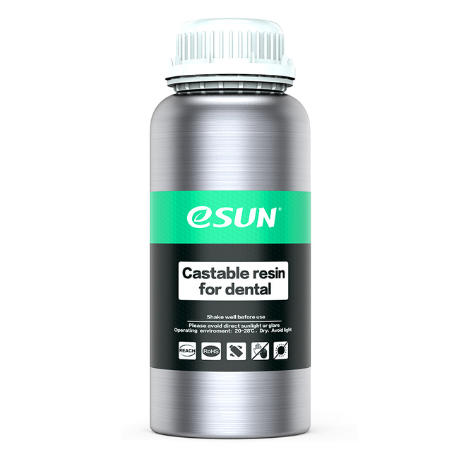 ESUN Castable - специальный фотополимер для применения в стоматологии. Это литьевая смола с очень низким процентом усадки (около 1,88-2,45%), гладкой поверхностью и высокой детализацией напечатанных изделий. По своим характеристикам она идеально подходит для изготовления дентальных моделей и совместима с большинством принтеров, печатающих по технологии DLP (волна засветки 395-405 нм).
