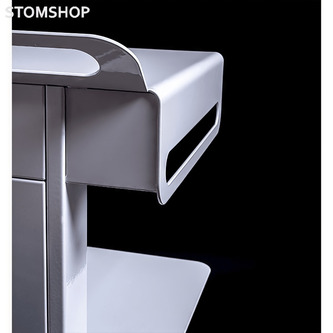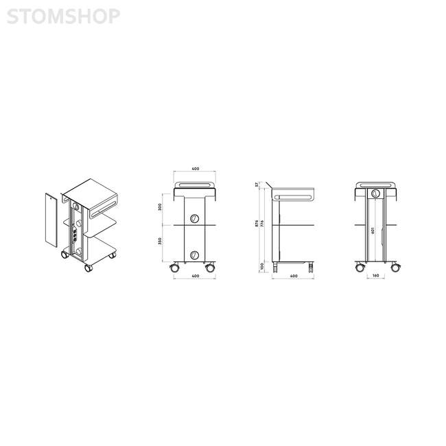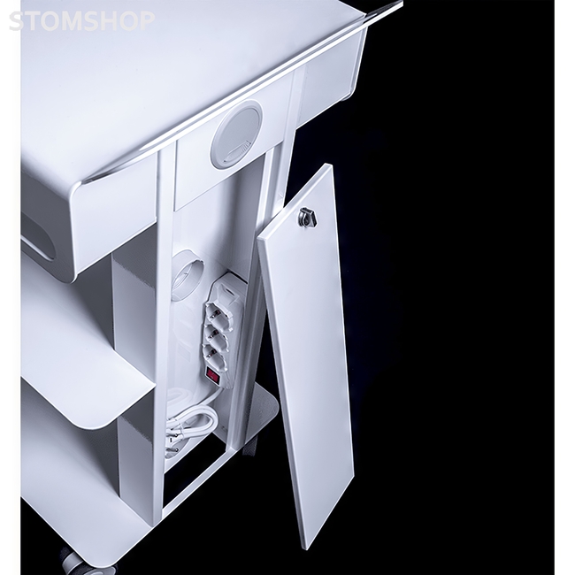 Стойка имеет технический отсек с предохранительным замком (в комплекте с 3 электрическими выходными розетками), а также три прорезные ручки, которые предназначены для удобного перемещения и позиционирования, размещения шнуров, кабелей, наконечников и т.д.