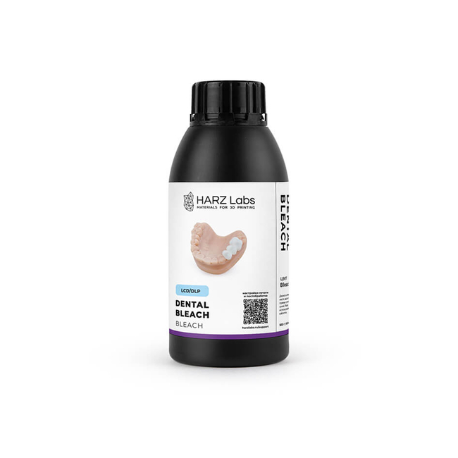 HARZ Labs Dental Bleach – это дентальный фотополимер для печати демонстрационных коронок и мостов. Он производится из биосовместимого сырья, не вызывающего аллергических реакций. Благодаря керамическому микро-наполнению, модели обладают повышенной стойкостью к внешнему воздействию.