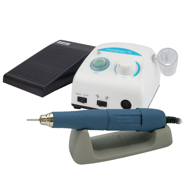 Микромотор зуботехнический в комплекте: блок управления для аппарата шлифовального зуботехнического, марки "Marathon", Marathon N7 (эл. мощность 45 Вт) с пластиковым держателем наконечника (SMT-HSEN) и подставкой, наконечник-микромотор SDE-SH40С (40000 об/мин, вращающий момент 4.5Н*см, диаметр 26мм), педаль FS60 плавного регулирования скорости и техпаспорт, SMT (Корея).