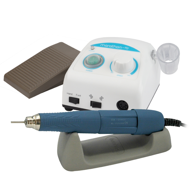 Микромотор зуботехнический в комплекте: блок управления для аппарата шлифовального зуботехнического, марки "Marathon", Marathon N7 (эл. мощность 45 Вт) с пластиковым держателем наконечника (SMT-HSEN) и подставкой, наконечник-микромотор SDE-SH40С (40000 об/мин, вращающий момент 4.5Н*см, диаметр 26мм), педаль SFP-27 включения/выключения скорости и техпаспорт, SMT (Корея).