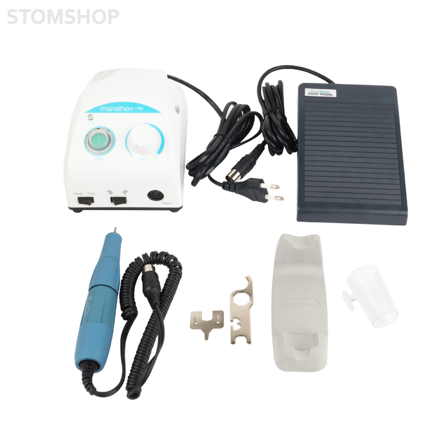 Микромотор зуботехнический в комплекте: блок управления для аппарата шлифовального зуботехнического Marathon N7 (эл. мощность 45 Вт) с пластиковым держателем наконечника (SMT-HSEN) и подставкой, наконечник-микромотор SDE-SH37L М 45 (40000 об/мин, вращающий момент 4,5 Н*см), педаль FS60 плавного регулирования скорости и техпаспорт, SMT (Корея)