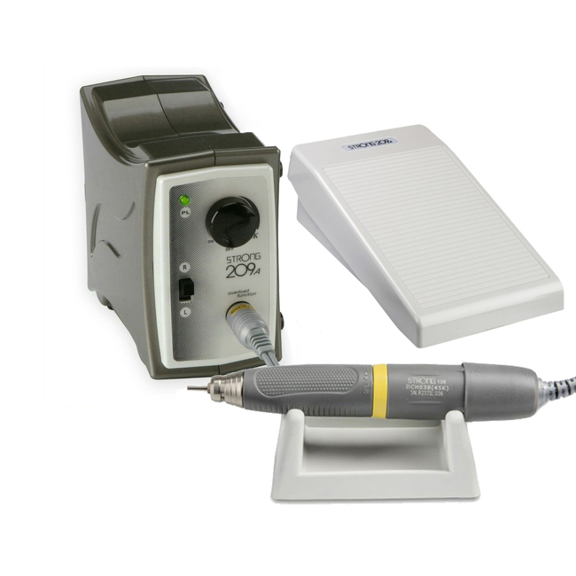 Щеточный микромотор STRONG 209A с наконечником 106 подходит для всех видов обработки в косметологических салонах и зуботехнических лабораториях.