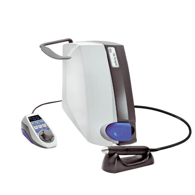 Пульт управления может крепиться как на стол, так и на стену при помощи кронштерна. Дисплей пульта отображает количество оборотов и режим работы. Удобная ручка управления контроллирует скорость. Кнопки позволяют переключаться между программами работы и между наконечниками.