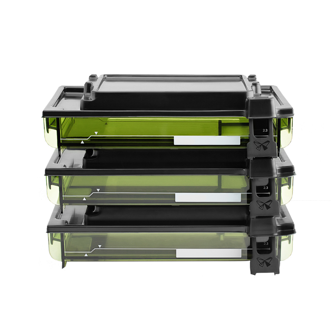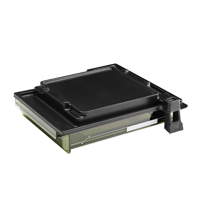 Для защиты расходного материала от внешних раздражителей в комплекте идет крышка. Каждому цвету и типу материала требуется отдельная ванночка, так как смешивание фотополимеров может привести к некорректной печати. Закрытая система дает возможность держать ванночки рядом с принтером, а специальные пазы позволяют им компактно стоять одна на другой. Таким образом вы всегда сможете выбрать материал, с которым хотите работать.