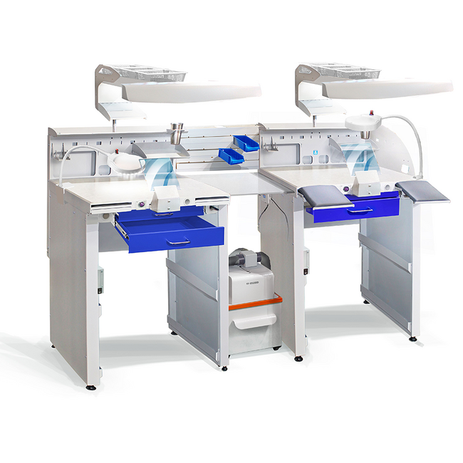 Отличительное преимущество столов серии Мастер - уникальная наращиваемая система хранения, способствующая порядку на рабочем месте. Организованное размещение оборудования, инструментов, материалов в рабочей зоне повышает производительность и качество работы зубного техника.