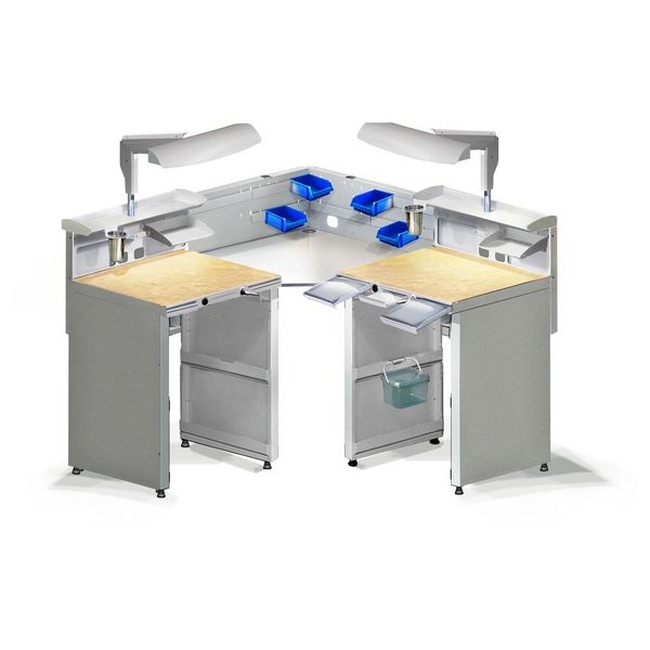 Обратите внимание: Угловой стол рассчитан на создание двух рабочих зон для одного техника, двоим за этим столом будет тесно. Чтобы за столом СЗТ 4.3 МАСТЕР КОНЕР было удобно работать двум зубным техникам, рекомендуем расширить его с помощью СТЕЛЛАЖ 1.0 МАСТЕР.
