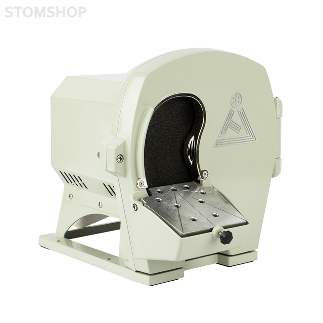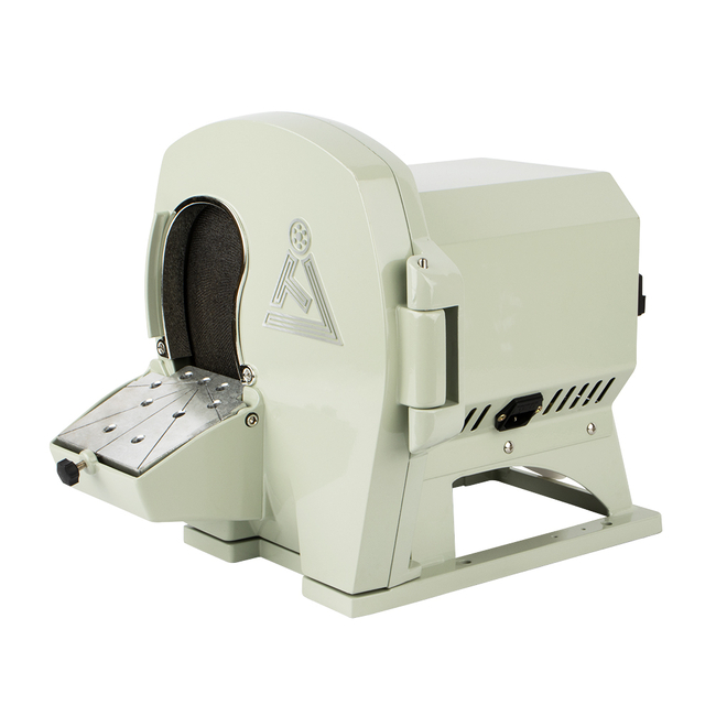 Столик имеет регулировку угла наклона рабочей поверхности, что позволяет при обработке выбрать оптимальное положение модели по отношению к диску. Конструкция кожуха выполнена таким образом, чтобы отработанный материал при обработке гипсовой модели не вылетал наружу, и собирался в специальном контейнере. После окончания работ кожух легко открывается, и обеспечивается доступ к внутренней части триммера для очистки шлифовального диска и контейнера.