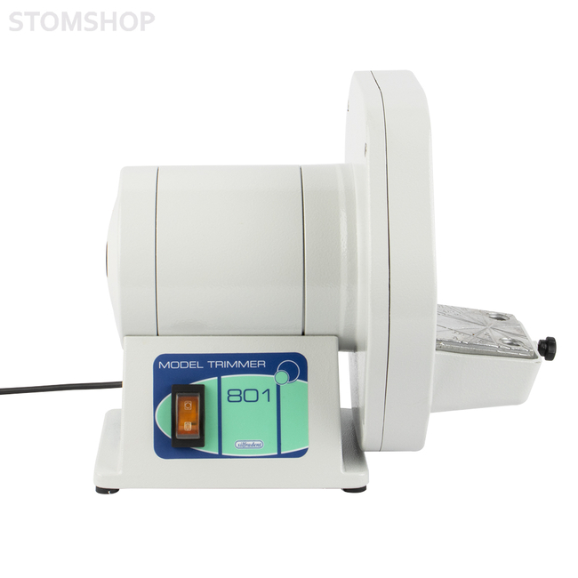 Trimmer 801S представляет собой установку, предназначенную для обрезки гипсовых моделей. Данная модель комплектуется электромотором, который поставляется в специальной упаковке и не требует специального обслуживания. Модель без системы водяного охлаждения, абразивный диск из наждачной бумаги. Оборудование отличается высокой мощностью благодаря мотору с высоким вращающим моментом, который обеспечивает вращение абразивного диска со скоростью 2800 оборотов в минуту. Все модели укомплектованы четырьмя опорными стойками, изготовленными из резины, что обеспечивает уменьшение вибрации и понижение уровня шума.