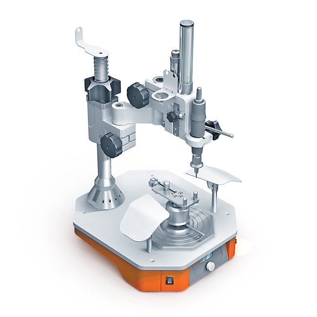 УСМФ 1.0 МАСТЕР АРТ – многофункциональное комбинированное устройство, объединяющее параллелометр, фрезерный станок, электрошпатель с функцией форсированного нагрева и бормашину с цифровой стабилизацией скорости. Предназначено для анализа и разметки моделей, а также любых сверлильно-фрезерных работ при изготовлении бюгельных протезов и индивидуализации абатментов мостовидных протезов с опорой на имплантаты.