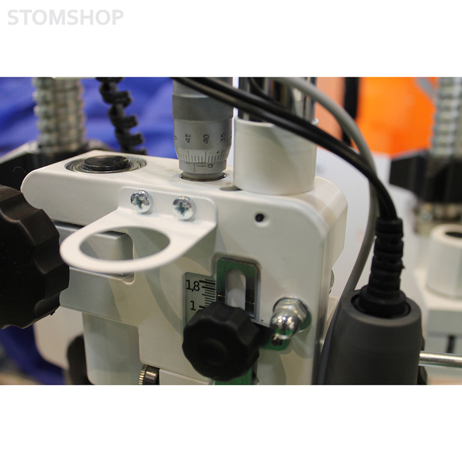 Каретка с универсальной головкой имеет плавный вертикальный ход от 0 до 18 мм, величина перемещения контролируется по шкале грубо или микрометром с точностью до 10 мкм, что дает возможность установить подходящую глубину сверления интерлоков.