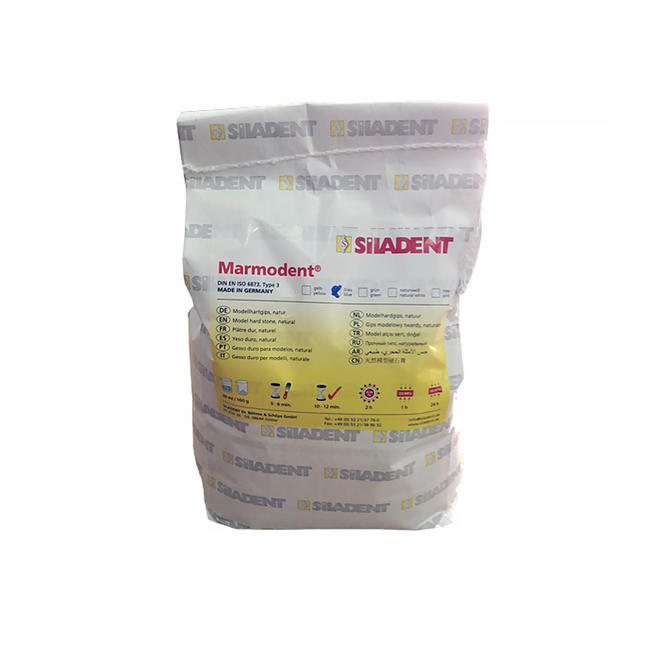 Marmodent – натуральный стоматологический гипс, 5 килограмм. Подходит для изготовления моделей под протезы и ортодонтические конструкции за счет особой структуры сырья и технологического процесса обработки.